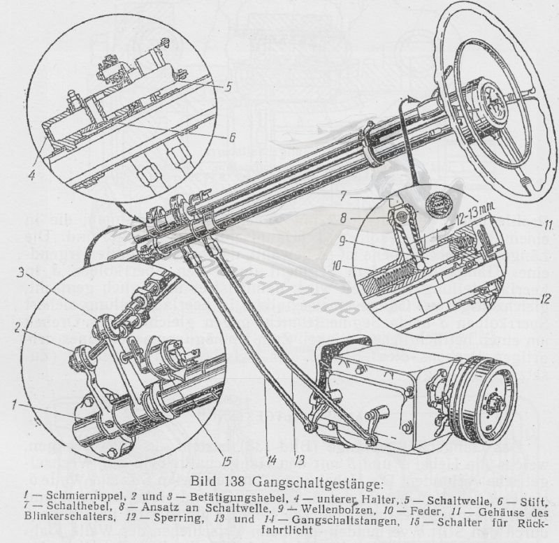 Das Gangschaltgestänge (Bild 138) besteht aus zwei Stangen, welche die Hebel 2 und 3 mit den Gangschalthebeln am Wechselgetriebe verbinden.